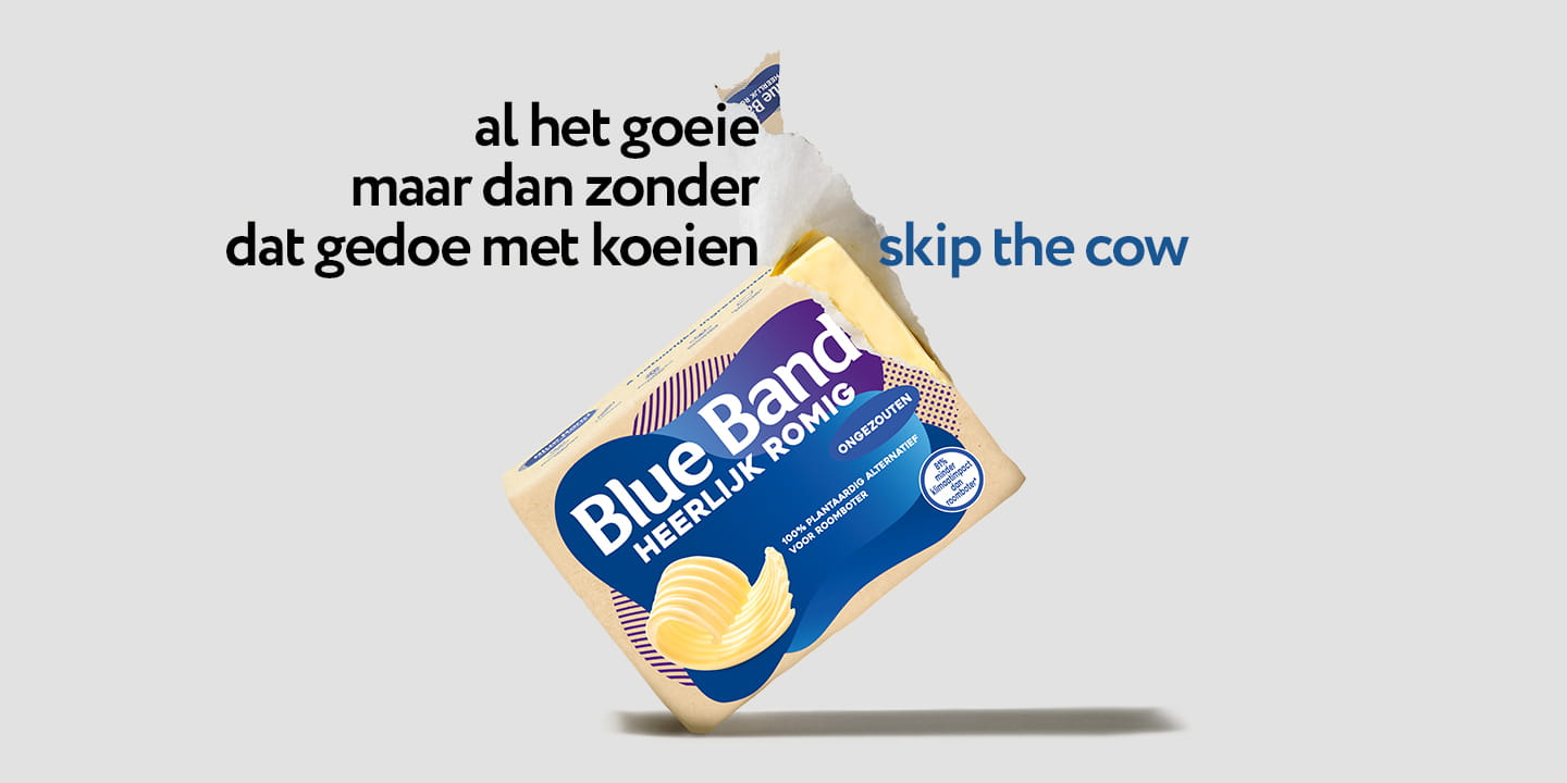 Blue Band heeft een eeuw lang moeten opboksen tegen het imago van zuivelboter. Maar in 2023 is daar Blue Band Heerlijk Romig, het plantaardige alternatief voor zuivelboter. Met Heerlijk Romig biedt Blue Band een heerlijk smaakvol en 100% plantaardig alternatief voor zuivelboter aan. Met slechts 6 natuurlijke ingrediënten is Heerlijk Romig palmolievrij, 100% natuurlijk en 100% plantaardig. Daarnaast heeft Blue Band Heerlijk Romig minstens 75% minder impact op het klimaat dan zuivelboter*. In 2024 onthult Blue Band als eerste in Nederland een kuip die gemaakt is van papier. Dus nu heeft Blue Band Heerlijk Romig niet alleen minstens 75% minder impact op het klimaat dan zuivelboter, de verpakking is nu ook beter voor de planeet.